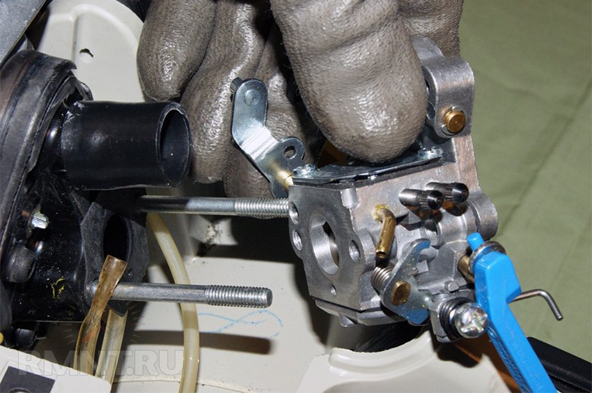 - Карбюратор находится сразу под воздушным фильтром, соединение с цилиндром двигателя может выполняться через адаптер.