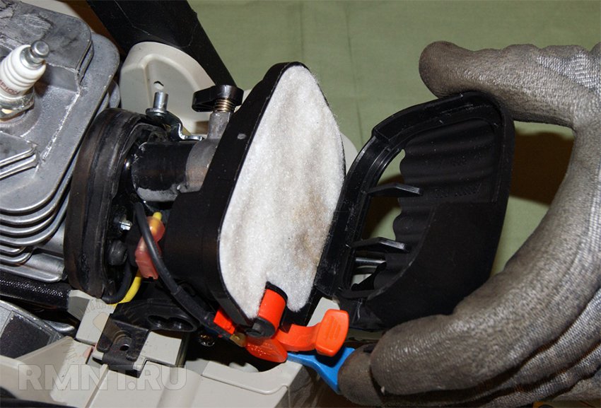 - Воздушный фильтр находится в верхней части бензопилы сразу под крышкой.
