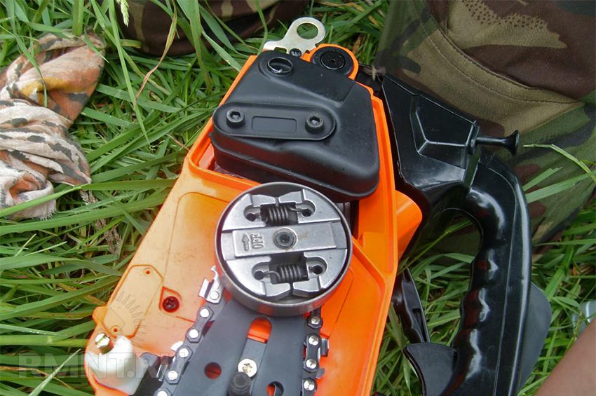 - Цепь, шина, сцепление и инерционный тормоз. Доступ можно получить, сняв боковую крышку с правой стороны, ослабив гайки крепления шины и болт натяжения цепи. Тормоз находится в полости крышки.