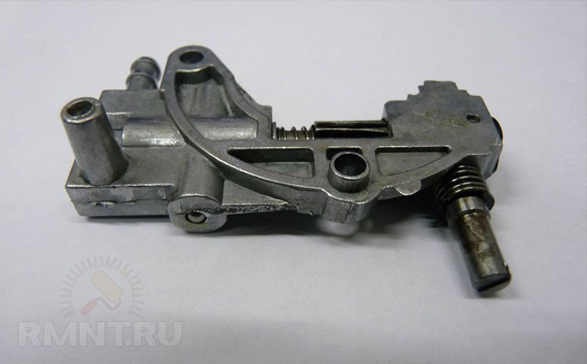 Недостаток смазки на цепи может быть причиной засорения каналов маслонасоса, его нужно вымыть в бензине и прочистить леской. Если при работе масло поступает слишком сильно, нужно немного затянуть регулировочный винт маслонасоса. Бывает, что при работе цепь сухая, а при простое масло сочится под сцеплением. Это значит, что герметичность масляного шланга нарушена и его нужно заменить.