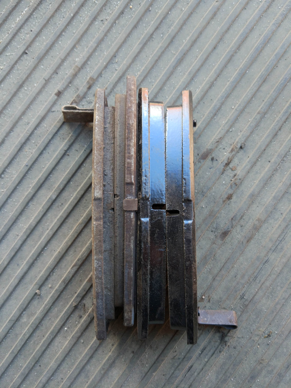 Кстати, старые колодки и диски беспокойств не доставляли, не скрипели и не пылили. Марку дисков опознать не получилось, колодки тоже (наружные пластины белого цвета).