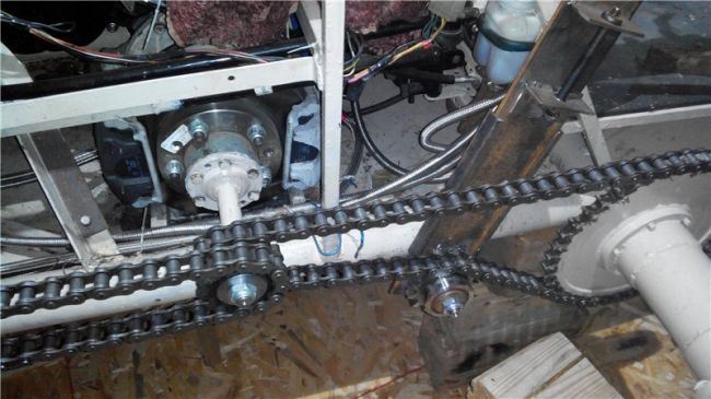 Была закреплена раздаточная коробка, так же она подведена к краю рамы, это необходимо, чтобы в будущем имелась возможность установки гребного винта без переделки ходовой.