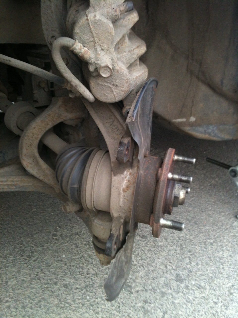 Далее – открутил болт нижней направляющей, задрал суппорт, снял его, предварительно открутив его крепеж к поворотному кулаку.