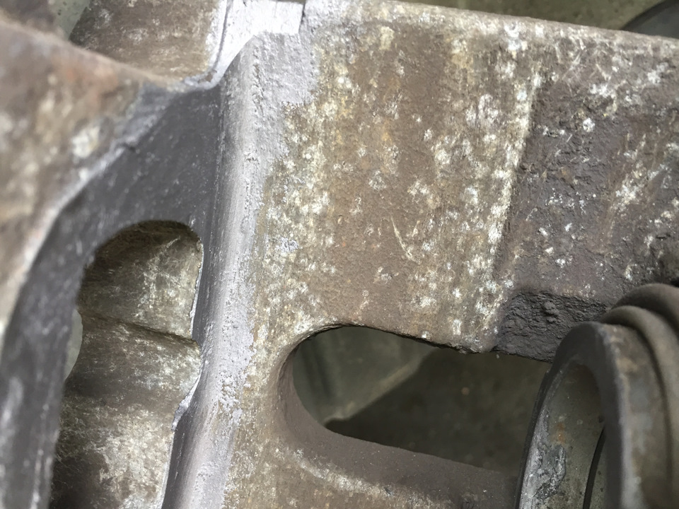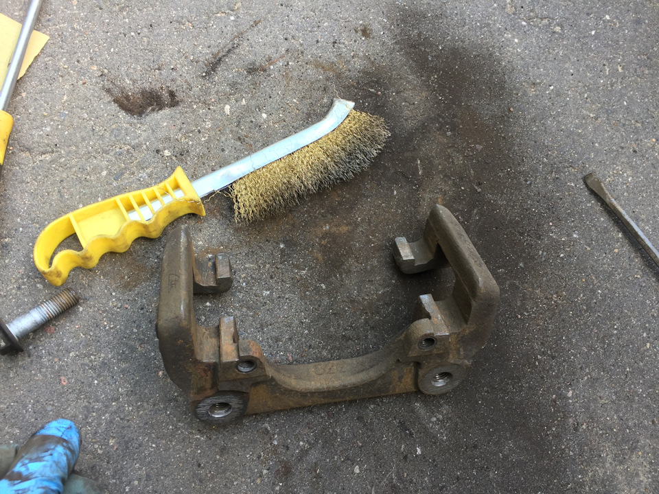 После снятия суппорта подвесил его на проволоке к пружине амортизатора и занялся очисткой его от грязи и слоистой ржавчины.