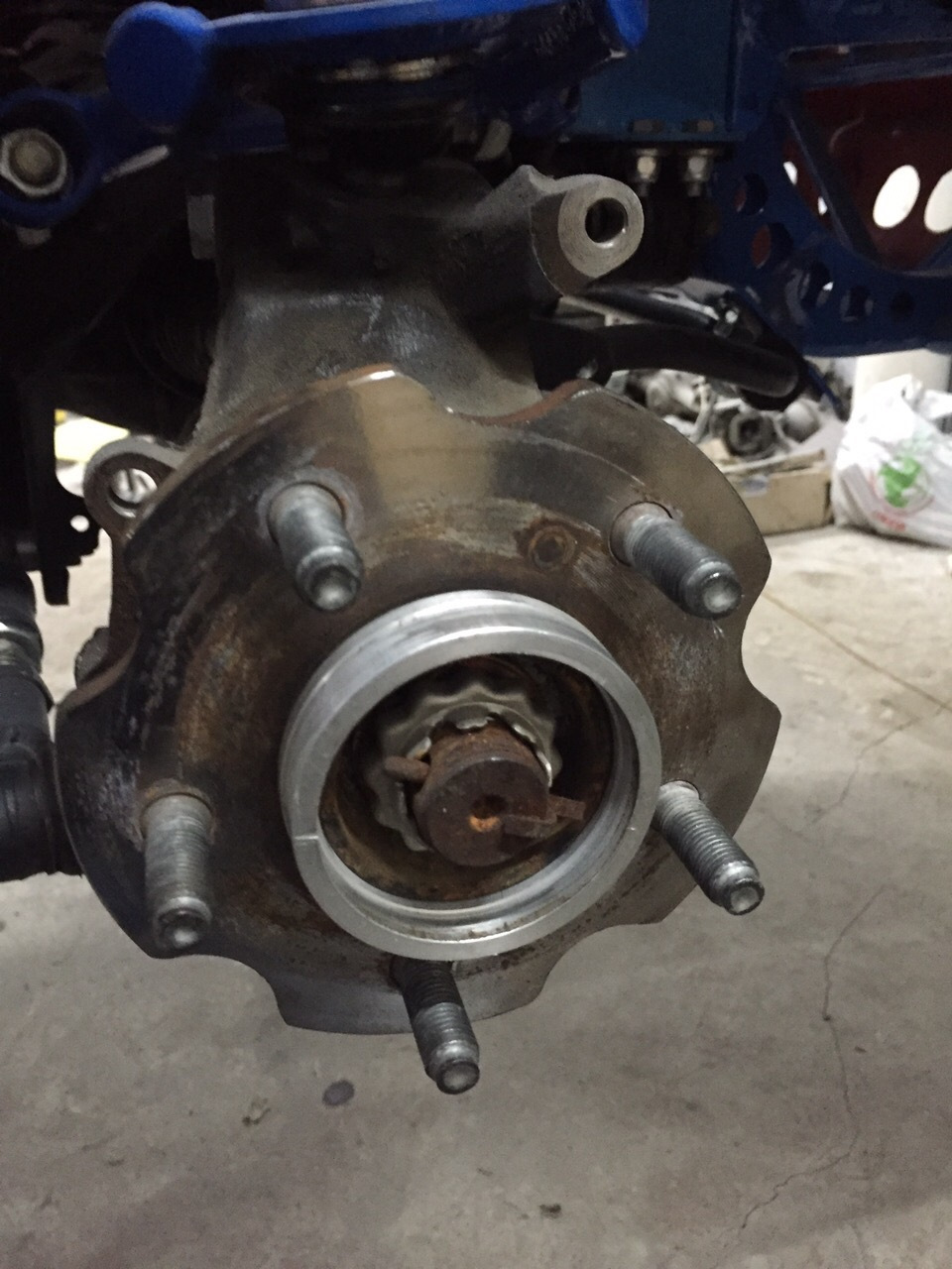 После того как с диском закончили и он нормально садится на ступицу можно приступать к сборке. Для этого нам понадобится пара шайбочек которые нужно подложить между скобой суппорта и ступицей, сто бы компенсировать разницу вылета.