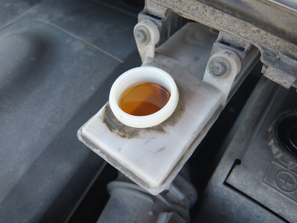 Открываю капот и контролирую уровень тормозной жидкости в расширительном бачке. Излишки откачиваю шприцем.