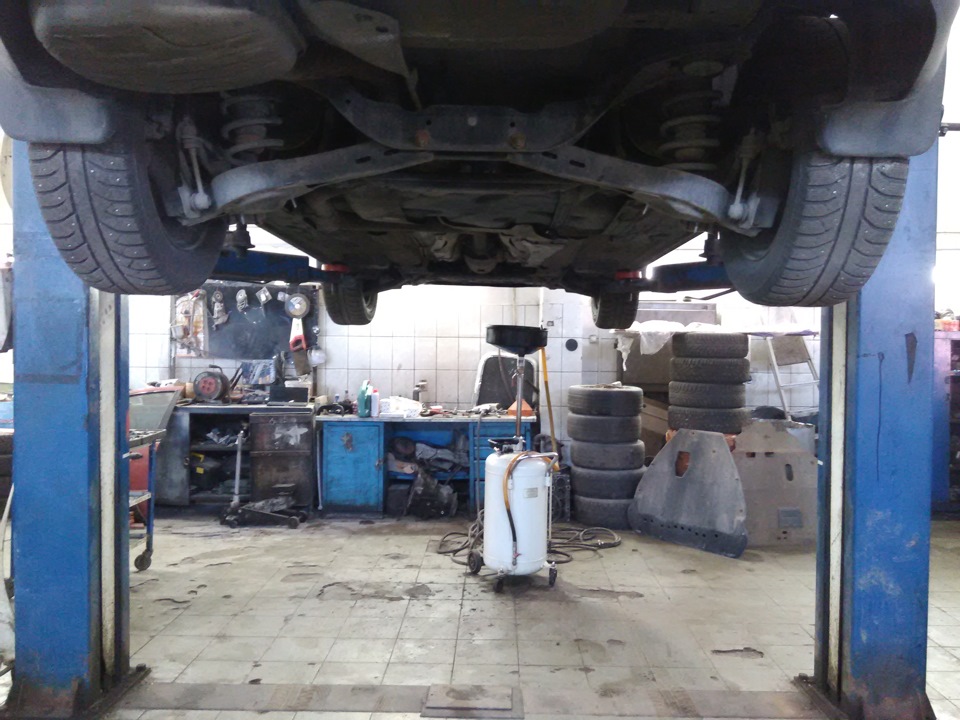 2. Ослабляем колесные гайки. Поднимаем автомобиль на подъемнике или домкратом приподнимаем переднюю часть автомобиля и устанавливаем ее на надежные опоры (для этого предварительно затормаживаем автомобиль стояночным тормозом и устанавливаем противооткатные упоры под задние колеса).