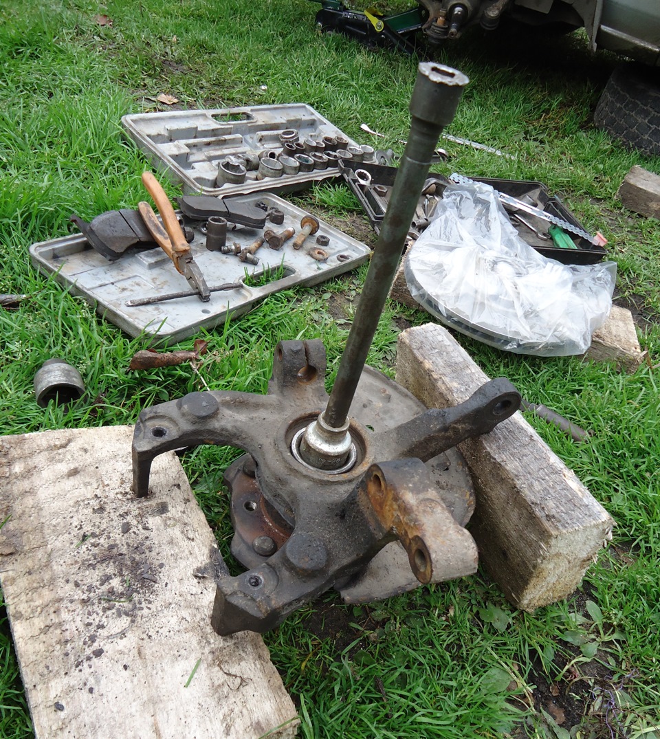 кладем его на опоры и мощными ударами молотка через проставку выбиваем ступицу, диск и одно из внутренних колец из кулака.