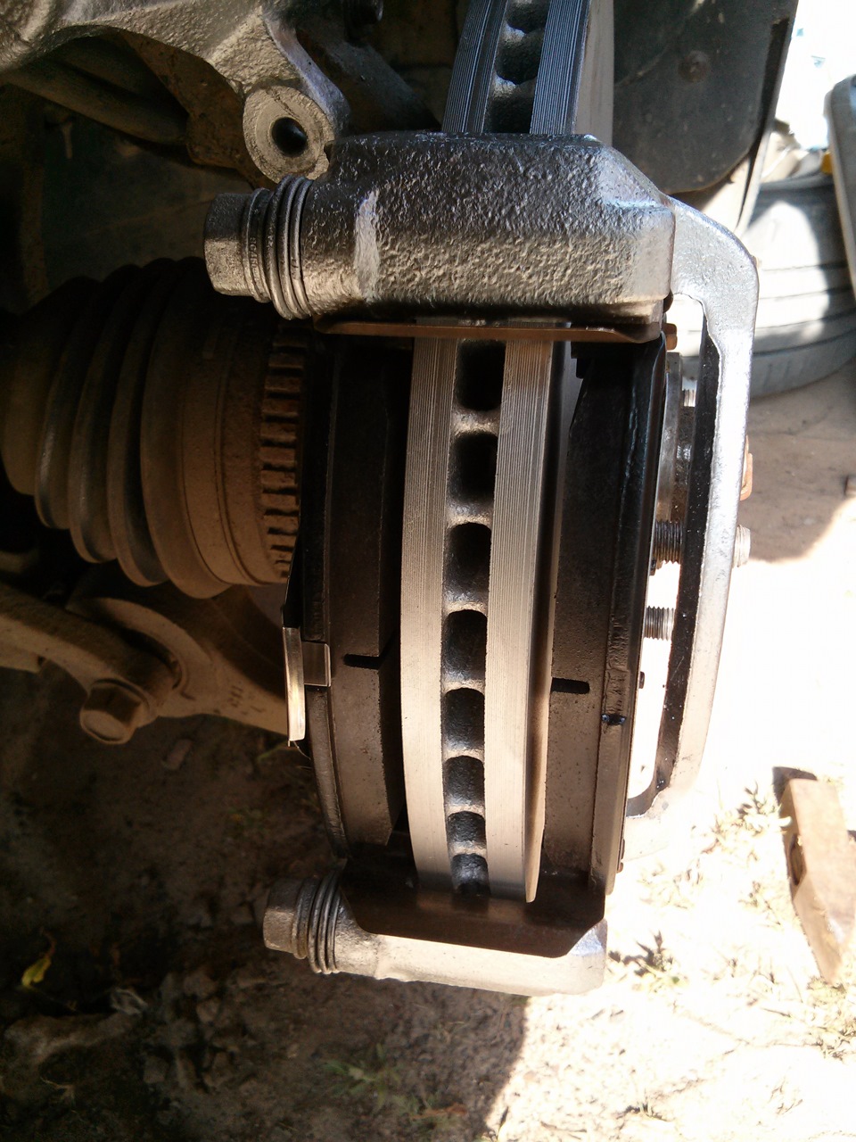 Предыдущие колодки были Sangsin и диски HMC. Толщина диска — 25,4 (номинал 26, min 24.4) Диски какбы еще ничего, но начали долбить при нагреве, а колодки почти под ноль. Ставил новое все вместе.