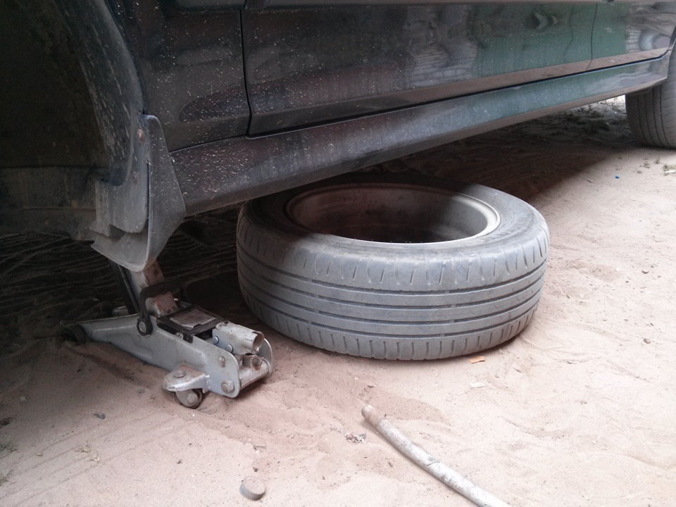 Срываем колесные болты, поднимаем авто, не забывает про безопасность: