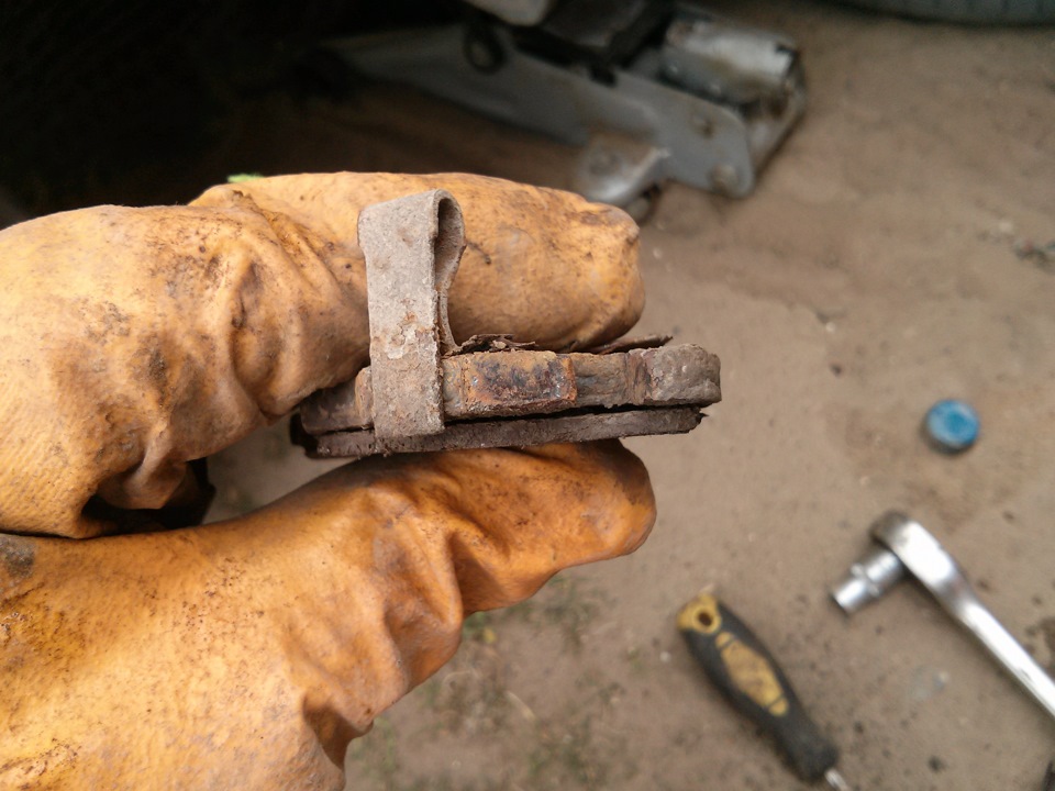 12. Снимаем старые тормозные колодки со скобы-держателя и удаляем их в отходы.