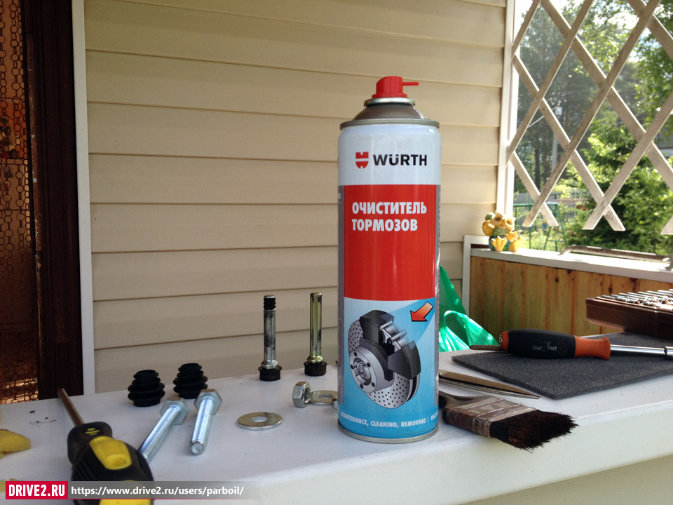 Прошла первая неделя отпуска, которая полностью была посвящена самостоятельному обслуживанию автомобиля. Первым делом были заменены старые передние тормозные диски и колодки на новые, которые были куплены еще в прошлом году. Ничего сложного в данной процедуре нет. Самым сложным было открутить скобу. Два болта с гровер шайбами очень крепко были затянуты и пришлось придумывать рычаг на ключ. Так же пригодилась ударная отвертка для винтов держащих сам тормозной диск. Диски снялись достаточно легко, за четыре с лишним года не прикипели. Скоба была снята, очищена от ржавчины, обезжирена и покрашена.