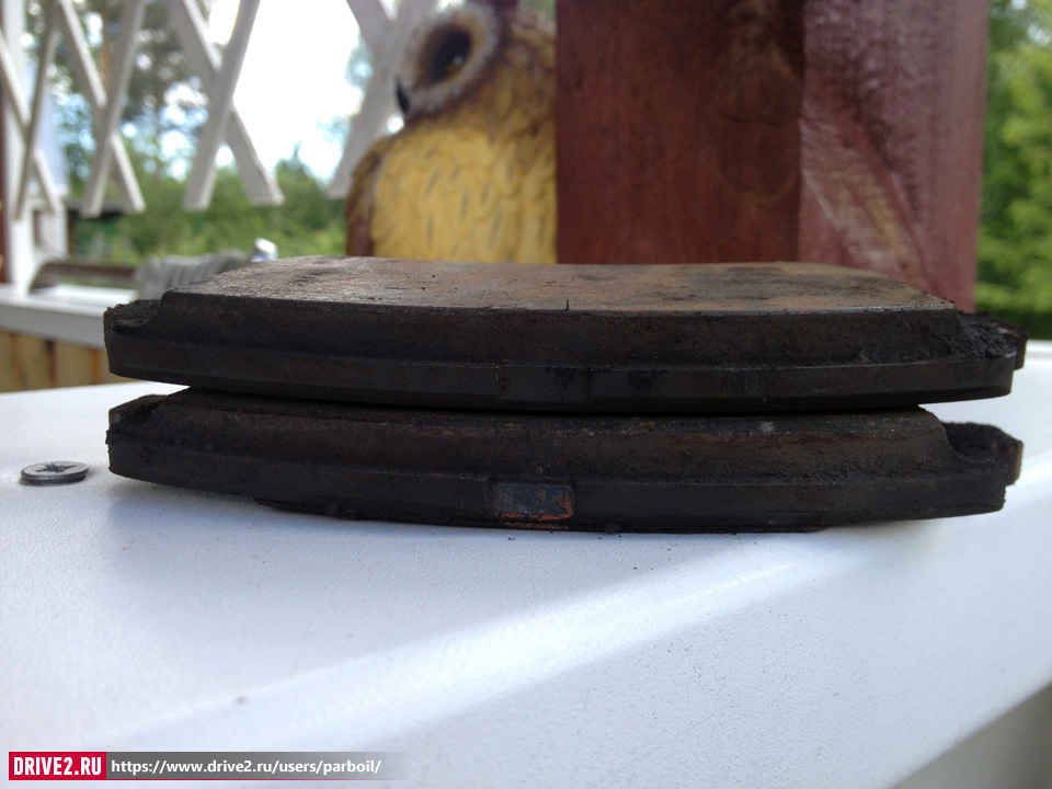 Все четыре снятые колодки сносились равномерно, что говорит о исправной работе тормозных суппортов. На фото колодки с одной стороны, внутренняя и внешняя.