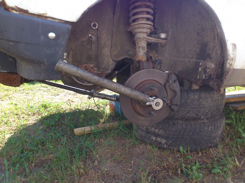 Принял решение поставить обратно на машину, чтобы, прокачав тормоза, заблокировать диски, и открутить всё-же гайки эти.
