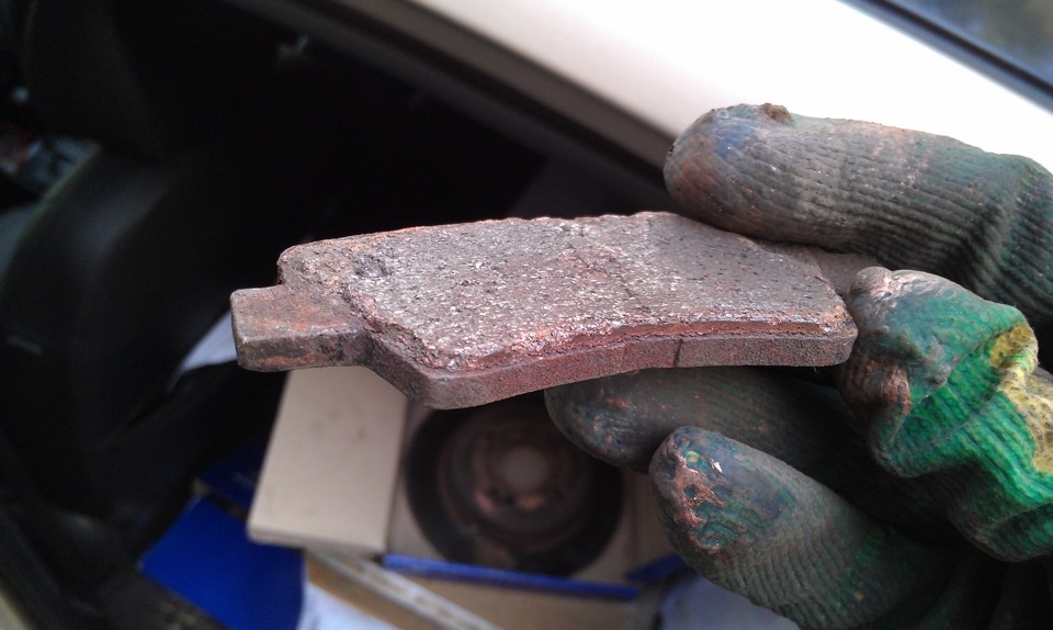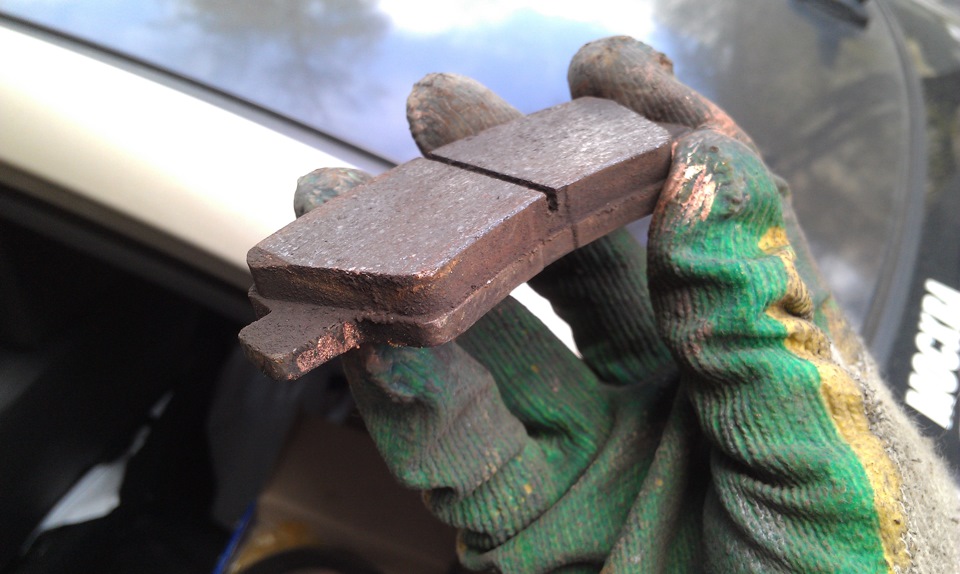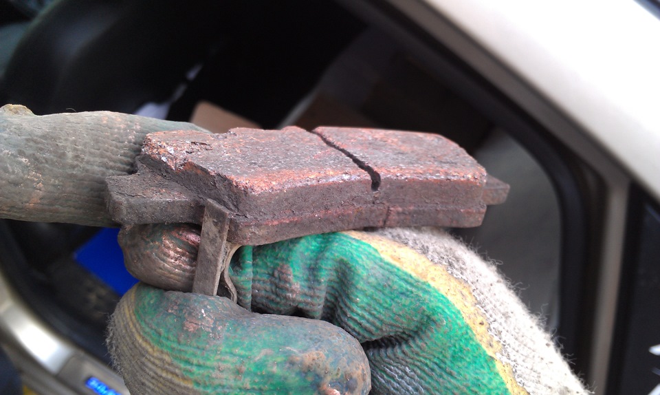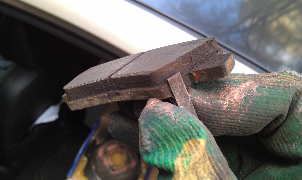 На обгрызенные края не обращайте внимание, это отвертками выковыривали колодки из пластин. Скорей всего из-за застревания колодки в пластине произошел такой ненормальный износ одной колодки, она не отжималась от диска. Так что обратите внимание, при установке новых колодок, чтоб сами колодки в пластинки вставали свободно и их не нужно было силой впихивать.