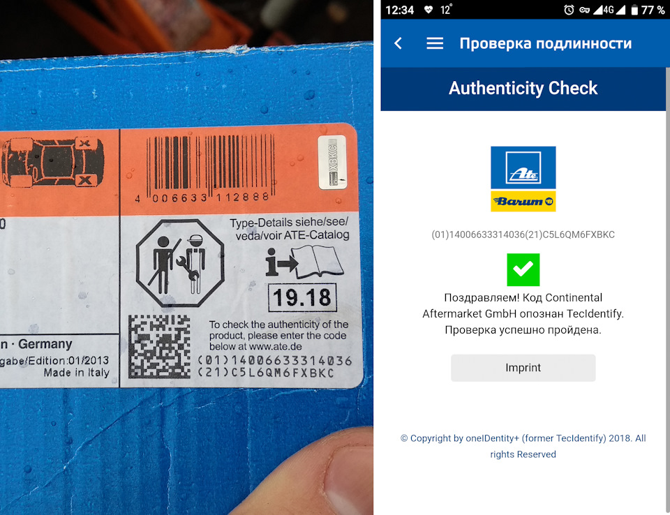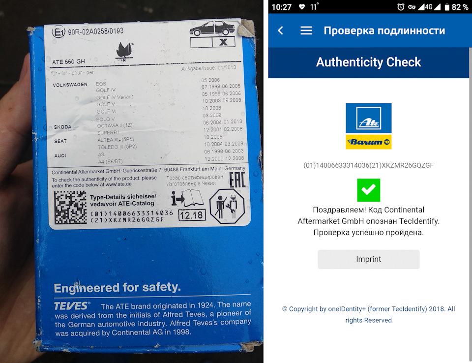 Колодки покупал ATE Ceramic с целью уменьшить количество пыли от колодок. На перед также планирую ставить их. Также на просторах Play Market нашел официальное приложение ATE Catalogue, в котором можно проверить подлинность купленных з/ч. Что и было сделано: