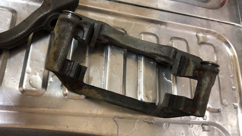 Очищаем их от накопившейся грязи. После этого можно снимать скобу суппорта. Одну из старых колодок оставляем, через неё мы будем вдавливать поршень, используя при этом стандартную струбцину: