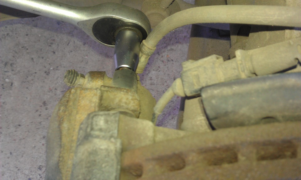 Ставим тачку на ровном месте, заднее колесо подпираем с двух сторон чтобы не скатилась, предварительно приоткручиваем болты колёс с двух сторон, домкратим переднюю левую сторону тачилы, снимаем колесо в сторону, для подстраховки под порог под твёрдую часть ставим пенёк или что-то другое, первым делом осматриваем резино-технические изделия, особенно тормозные шланги (если есть трещины — только замена!), поворачиваем рулевое колесо в сторону снятого колеса, поднимем капот и откручиваем пробку расширительного бачка ТЖ (при сжатии поршней суппортов будьте готовы к отбору лишней ТЖ), предварительно очищаем суппорт от грязи (использовал щётку по металлу мягкую, спрей клиннэр очиститель суппортов), отсоединяем разьём датчика износа колодок,