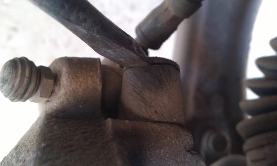 Чтобы снять суппорт, нам пришлось при помощи крепкой плоской отвёртки немного отжать колодки: