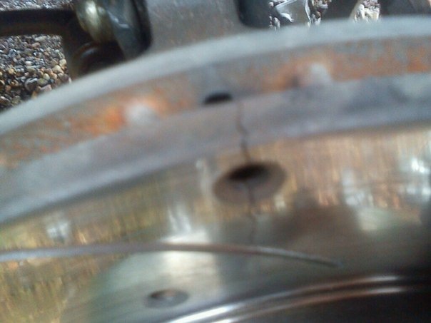 В мою голову приходит только одно — перегрев тормозного диска и как следствие трещина в отверстие-перфорации. Лично сам с такой проблемой не сталкивался, поэтому интересуюсь у Вас!