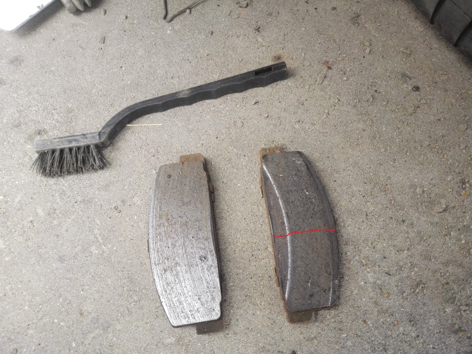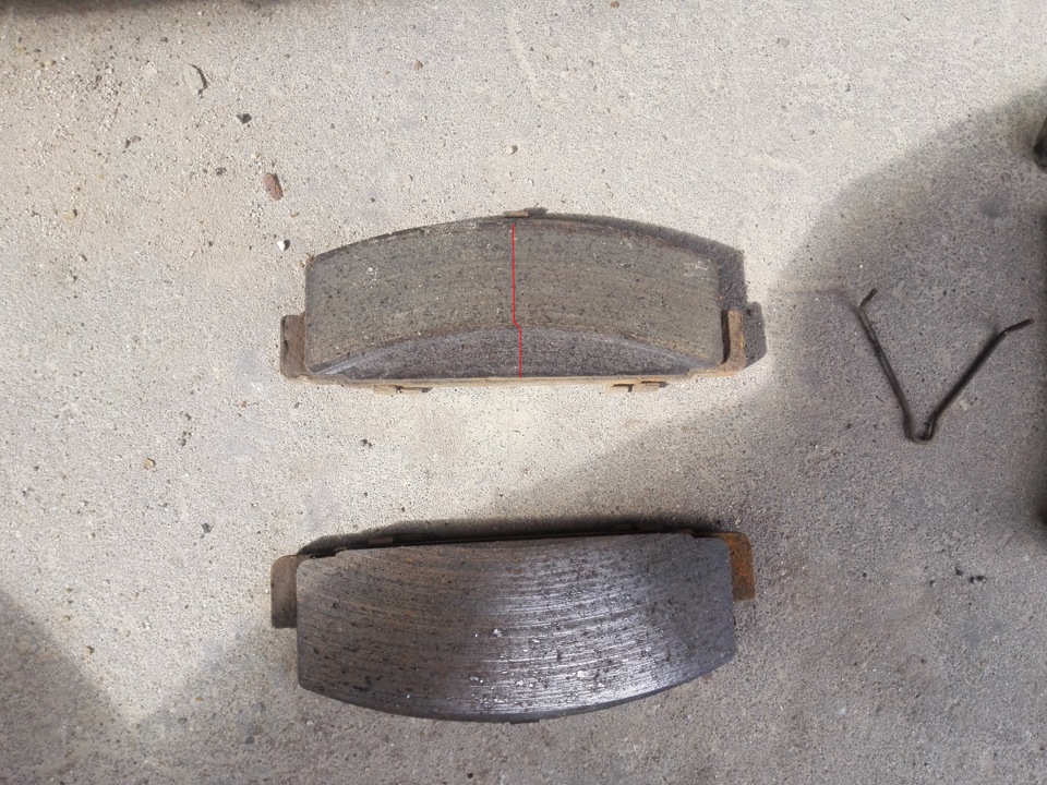 Колодки с внутренней стороны стачивались не равномерно. Для более наглядного представления неровности я подчеркнул красной чертой.