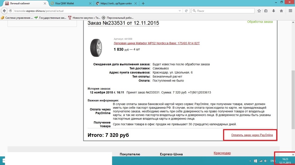 Начав свои поиски наткнулся на не безызвестный экспресс-шина.ру где нужные мне шины по 1645 руб. дело было вечером 11.11.15, не долго думаю оформляю заказ, все отлично, заказ создается, сайт дает сообщения что менеджер свяжется, я со спокойной душой ложусь спать, в предвкушении завтра забрать шины, расплатиться, думаю когда лучше переобуваться.