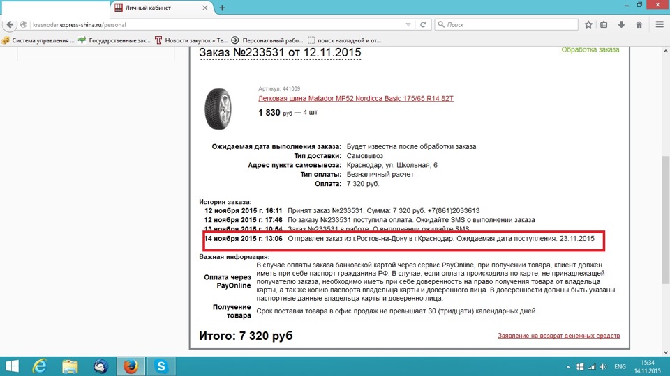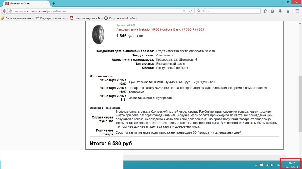 Видя это, думаю вот чудаки (через м), звоню в эту конторку, объясняю ситуацию, продавун говорит что нет, нету этих колес по 1645, на сайте просто информации еще не обновилась, а заметьте в 16.00 я уже на сайте видел обновленную цену, думаю хрен с тобой, завтра когда можно будет забрать (на сайте же указано в наличии, самовывоз завтра + девушка утром сказала сегодня оплатите, завтра заберете), на что получаю ответ завтра Вы их не как не получите, шины едут из Ростова, должны быть до 20.12.15, а что уже сделать, дважды деньги оплатил, по факту мне еще первый платеж не вернулся, соглашаюсь. В расстроенных чувствах и мыслю какой же я лошара (нужно было слушать чужие отзывы, а негатива по моему у многих по поводу этой конторки достаточно), сажусь писать эту предупредительную записку. В 17.47 пришла смс от магазина о поступлении оплаты. Возврата по первой оплате еще не пришел (смотрю в банк клиенте).