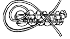 Для укрепления шины берут кусок проволочной лигатуры длиной 140—160 см и протирают его тампоном со спиртом, этим одновременно устраняются завитки и придается лигатуре ровное направление. Затем разрезают ее на отрезки длиной 6—7 см для передних зубов и 14—15 см для боковых. Каждый отрезок изгибают в виде шпильки, имеющей один конец длиннее второго, и придают шпильке полукруглую форму. Шину привязывают к зубам лигатурой одиночной узловой косой вязью. С этой целью проводят оба конца шпильки со стороны полости рта через промежутки, имеющиеся между намеченным зубом и двумя соседними, таким образом, чтобы проволока охватила зуб с обеих сторон.