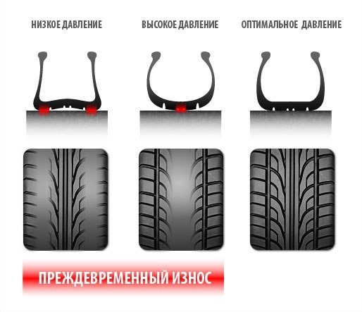 При движении по асфальту неправильное давление в шинах (как повышенное, так и пониженное) приводит к уменьшению пятна контакта с дорогой. Перекаченное колесо цепляется за поверхность лишь центральной частью, что ведёт к её быстрому износу. Плохо накаченная шина наоборот «садится» на боковины, опираясь на плечевые зоны протектора и проминая центральную часть внутрь. Вот как это выглядит: