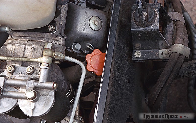 Что в этом КамАЗе нового? Если коротко, то, во-первых, шины размером 425/85R21 с индексом скорости J, соответствующим допустимой скорости 100 км/ч. И по нагрузочной способности их вполне достаточно для этой машины. А во-вторых, на нем установлена коробка передач ZF 9S 109-494, 8-ступенчатая, с передаточным числом высшей передачи 0,74. Зачем мы заострили ваше внимание на этом, будет понятно дальше. В-третьих, кабина нашего автомобиля оснащена гидроподъемником. В данном случае – это необходимость: поднять кабину, находящуюся на такой высоте, вручную просто невозможно. Из нового, пожалуй, все.