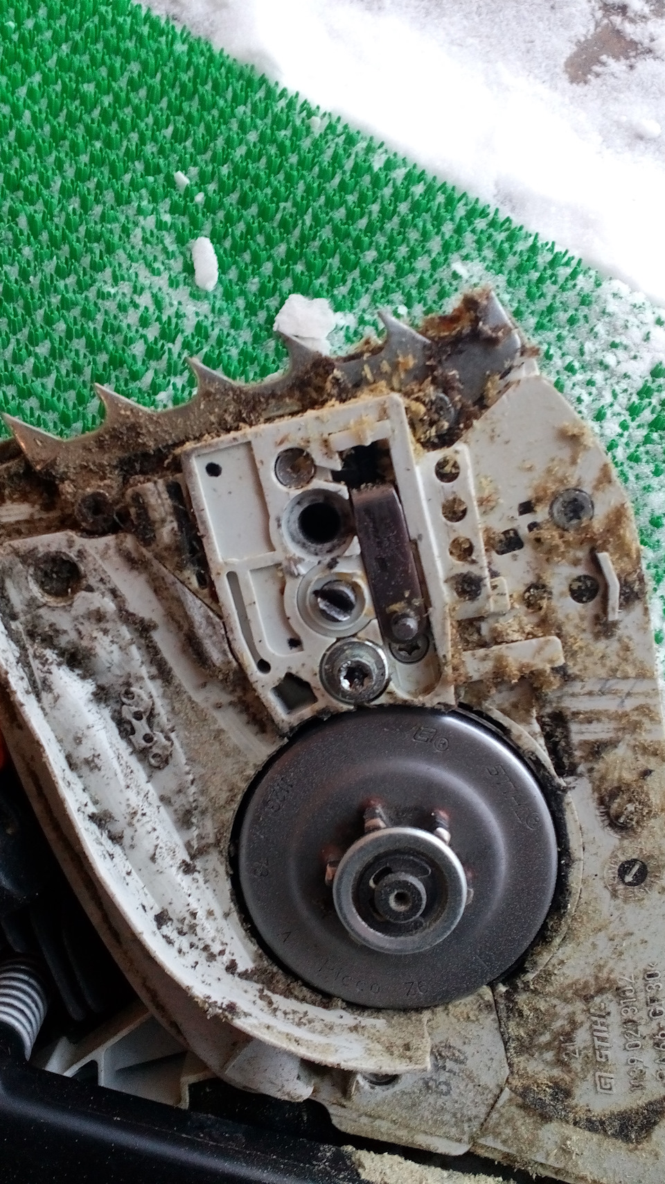 Собрал пилу гораздо быстрее, чем разбирал. Пришло время шины – ее паз меньше наших новых шпилек – берем болгарку и аккуратненько за несколько итераций расширяем паз. Все, собираем, аккуратно затягиваем гайки, пробуем.