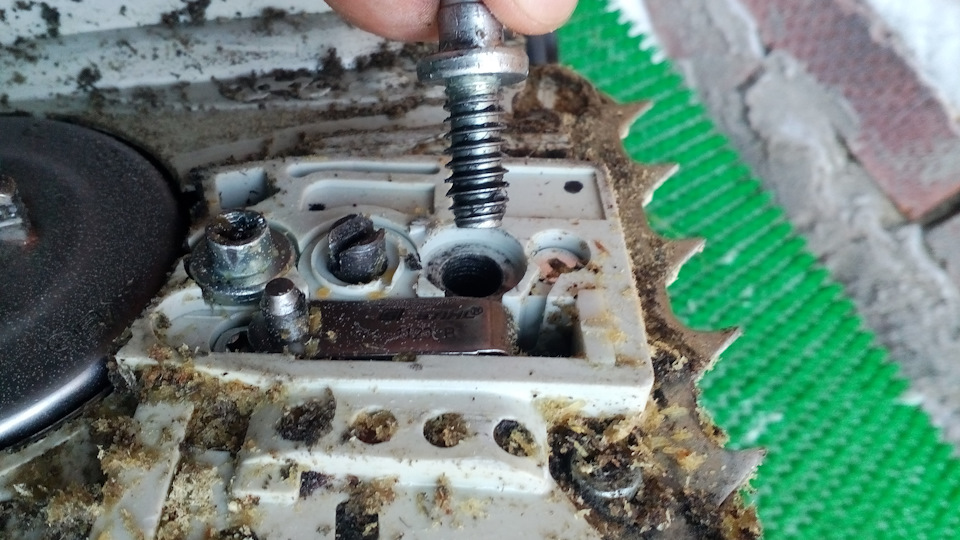 И сюрприз – гаек на шпильках нет, но шпилька такой формы, что вытащить и поменять их без полной разборки корпуса пилы Champion 138 просто невозможно. Ай да конструкторский гений – поставить тонюсенькие болтики и так усложнить их замену. Выбиваем, понимаем, что найти такие можно только в интернете, но также понимаем, что каждый раз заниматься такой заменой мне лично вообще не хочется.
