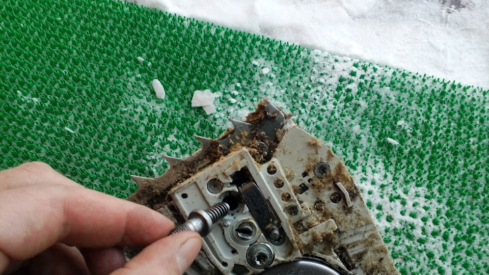 Чтобы добраться к обратной стороны шпилек нужно вскрыть пластиковый корпус пилы. Делать нечего – разбираем её полностью. Для этого по всему периметру крестовой отверткой выкручиваем винты-шурупы. Их много, но благо они все одинаковые, не надо запоминать что откуда. Есть вероятность потерять пружинки из конструкции стопор-ручка газа, так что там внимательнее. Открутить также придется и тросик газа, снять один шла нчик с подсоса (осторожно, брызгает). Долго не мог раскрыть корпус – не хотел сломать но и не открывался, что-то мешало, наконец то понял – крышка масляного бачка… Вот и пришла очередь маховика – откручивается гайка непросто, так что нужно постараться ничего не сломать. Ну и когда гайка откручена – маховик сидит на герметике и на коническом валу (вспоминается сразу мотоциклетный магнит на коленвале) — пара точных и резких ударов по валу и маховик в руках – не теряем шпильку. И ТОЛЬКО ТОГДА мы получаем доступ к шпилькам.