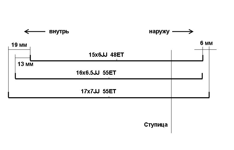 Как видно 15″ и 16″ диски по наружней стороне стоят совершенно одинаково. А при установке 17″ диска, он будет выступать наружу всего на 6 мм.