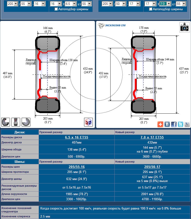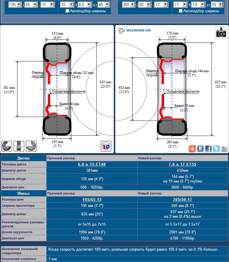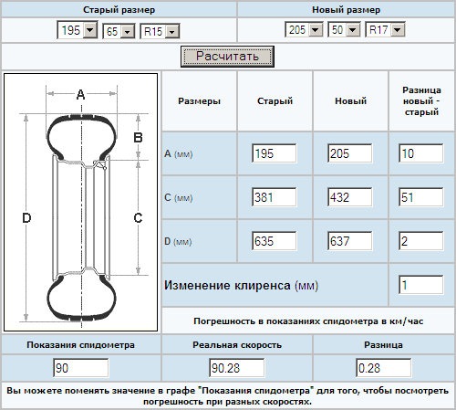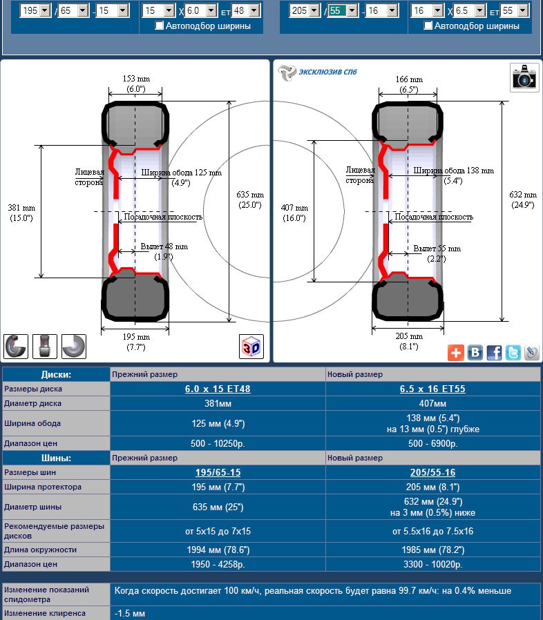 Во-вторых, в прекрасном визуальном шинном калькуляторе сравнил размеры штатных колёс: