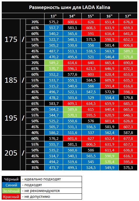 Подбор и поиск размера шин по модели Kalina. Таблица штатных, заводских размеров шин LADA