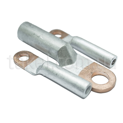 Мы друг друга не поняли. Вот в те наконечники, зажать алюминий можно, я не спорю. Но выполнять им ответственное соединение ни один монтер не будет. А не будет потому, что этот наконечник предназначен для присоединения к шинам кабелей там, где механические нагрузки отсутствуют. А соединение алюминиевых шин с вводами производится так: на шпильку медную накручивается гайка, надевается алюминиевый аппаратник, и прижимается еще одной гайкой. Разумеется при этом наносится слой циатима или эпс98, но контакт медь-алюминий происходит без всяких переходных пластин или луженых наконечников.